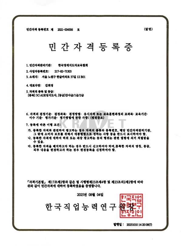 3C¡¤AIÄÚµùÁöµµ»ç ÀÚ°ÝÁõ µî·ÏÀº Çѱ¹Á÷¾÷´É·Â°³¹ß¿ø¿¡¼ È®ÀÎÇÒ ¼ö ÀÖ½À´Ï´Ù.