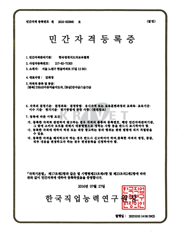 Çѱ¹¿µÀçÁöµµÀÚ±³À°Çùȸ¿¡¼ ¹ßÇàÇÏ´Â ÀÚ°ÝÁõÀº Çѱ¹Á÷¾÷´É·Â°³¹ß¿ø¿¡ µî·ÏµÇ¾î ÀÖ½À´Ï´Ù. |