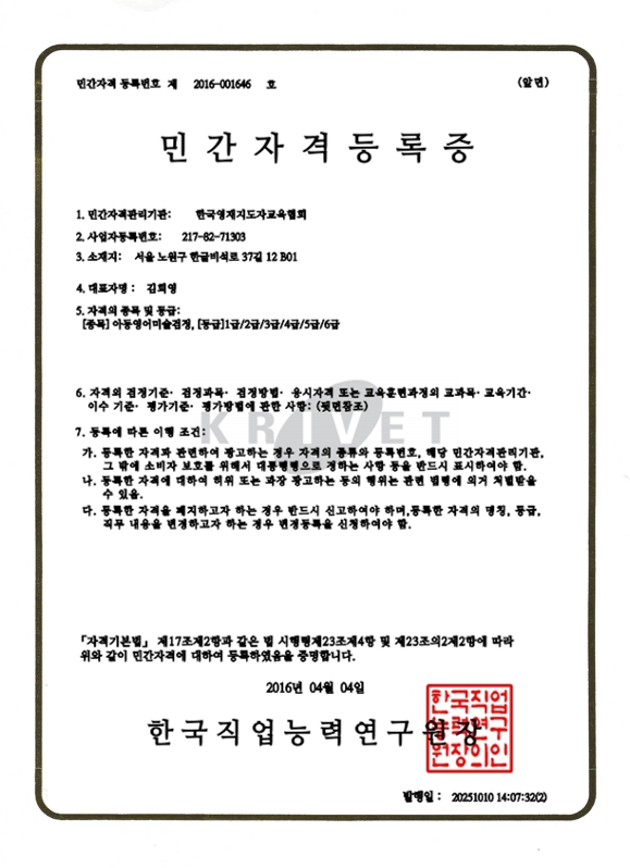 ¾Æµ¿¿µ¾î¹Ì¼ú°ËÁ¤ ÀÚ°ÝÁõ µî·ÏÀº Çѱ¹Á÷¾÷´É·Â°³¹ß¿ø¿¡¼ È®ÀÎÇÒ ¼ö ÀÖ½À´Ï´Ù.