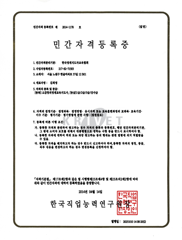 Çѱ¹¿µÀçÁöµµÀÚ±³À°Çùȸ¿¡¼ ¹ßÇàÇÏ´Â ÀÚ°ÝÁõÀº Çѱ¹Á÷¾÷´É·Â°³¹ß¿ø¿¡ µî·ÏµÇ¾î ÀÖ½À´Ï´Ù. |