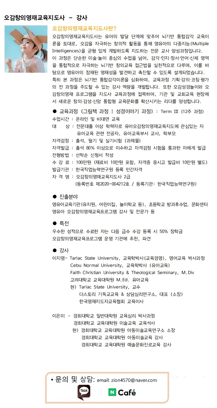 ¿µÀ¯¾Æ ¿µÀç±³À°¿¡ ´ëÇÑ Àü¹ÝÀûÀÎ ÀÌÇØ¸¦ °®°í, ¿À°¨Ã¢ÀÇ¿µÀç±³À°ÇÁ·Î±×·¥(MIT-Kids program)À» ½Ç½ÃÇÒ ¼ö ÀÖ´Ù. ¿µÀ¯¾Æ Ç¥ÇöȰµ¿, ½ÅüȰµ¿, ¾ð¾îȰµ¿À» ÀÌÇØÇϰí, ¼ö¾÷À» ¼³°èÇÒ ¼ö ÀÖ´Â Áß±Þ ¼öÁØ.